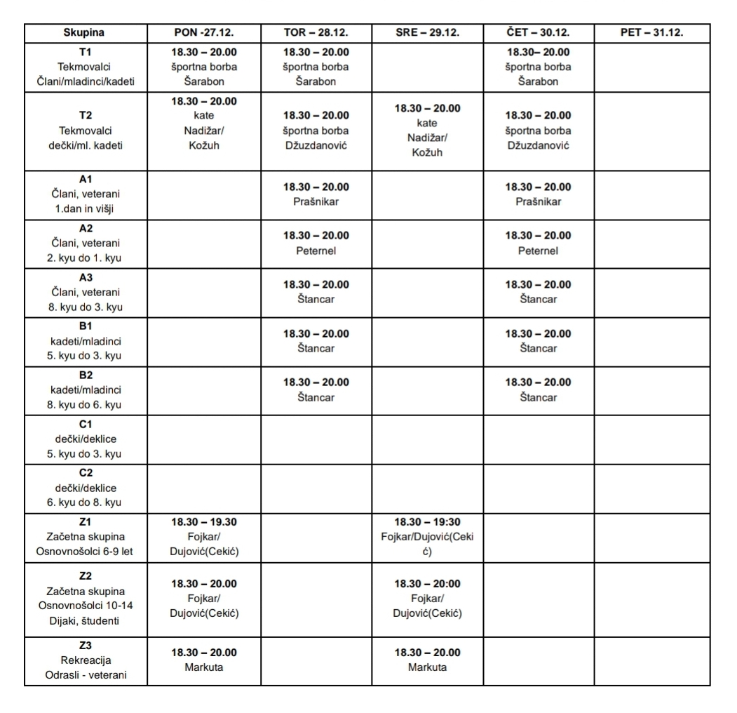 Urnik vadbe 24.12. in med božično-novoletnimi počitnicami
