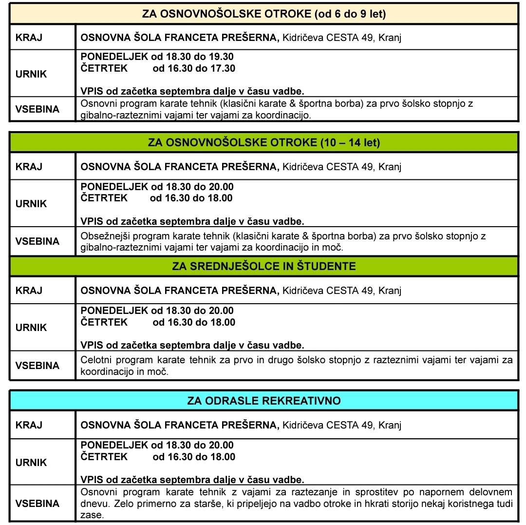 Vabimo vas, da se vključite v vadbo karateja na naših začetnih tečajih. Karate je primeren za vse starostne skupine ne glede na spol. Naučili vas bomo osnov tradicionalne okinavske šole karateja