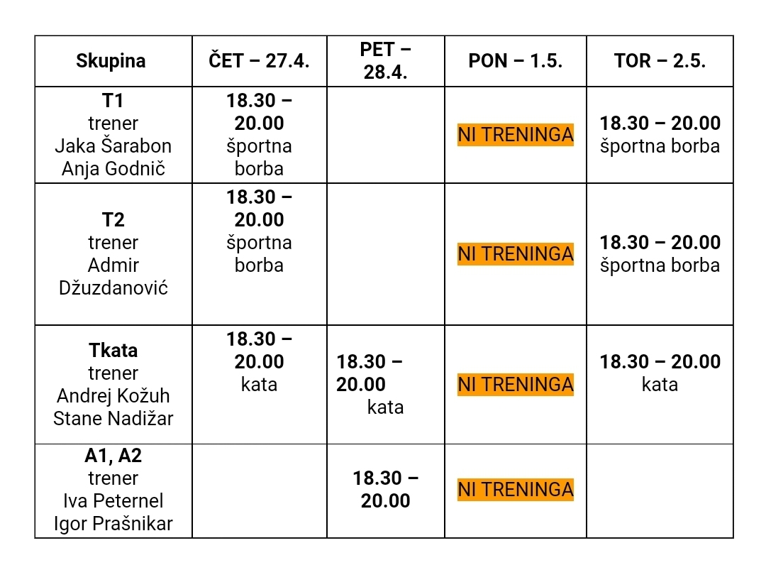 Obveščam vas, da bodo treningi med prvomajskimi počitnicami (26.4. do 2.5.2023) potekali po spodaj navedenem urniku vadbe.
