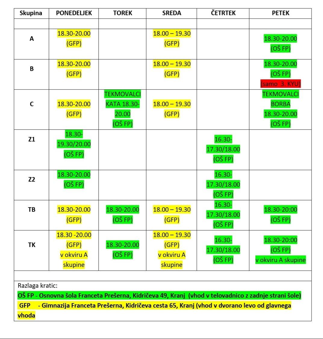 Urnik treningov